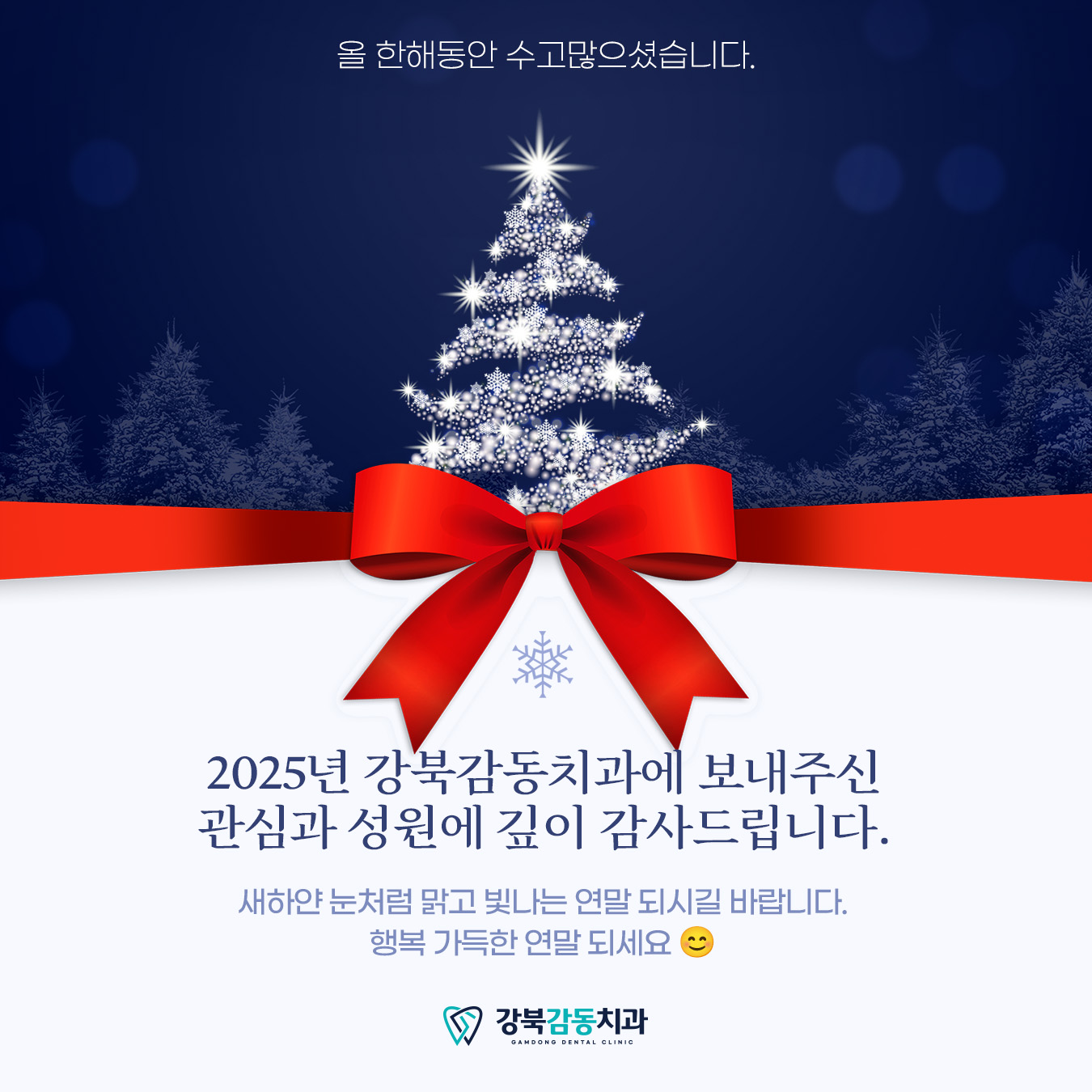 치과 소개 2025.12.08 2025년의 마지막 날, 고마운 마음을 전합니다 안녕하세요, 쌍문역 강북감동치과입니다. 달력의 마지막 장이 어느덧 하루밖에 남지 않았습니다. 여러분의 2025년은 어떤 기억들로 채워지셨나요? ✨ 2025년, 함께해주셔서 감사합니다 올…